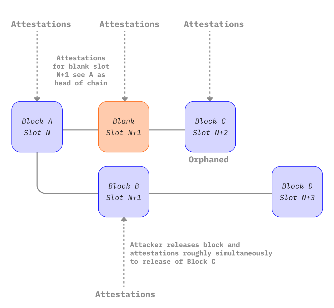 Several papers have explained attacks on Ethereum that achieve reorgs or finality delay with only a small proportion of the total staked ether. These attacks generally rely upon the attacker withholding some information from other validators and then releasing it in some nuanced way and/or at some opportune moment. They usually aim to displace some honest block(s) from the canonical chain. Neuder et al 2020opens in a new tab showed how an attacking validator can create and attest to a block (B) for a particular slot n+1 but refrain from propagating it to other nodes on the network. Instead, they hold on to that attested block until the next slot n+2. An honest validator proposes a block (C) for slot n+2. Almost simultaneously, the attacker can release their withheld block (B) and their withheld attestations for it, and also attest to B being the head of the chain with their votes for slot n+2, effectively denying the existence of honest block C. When honest block D is released, the fork choice algorithm sees D building on top of B being heavier than D building on C. The attacker has therefore managed to remove the honest block C in slot n+2 from the canonical chain using a 1-block ex ante reorg. An attacker with 34%opens in a new tab of the stake has a very good chance of succeeding in this attack, as explained in this noteopens in a new tab. In theory, though, this attack could be attempted with smaller stakes. Neuder et al 2020opens in a new tab described this attack working with a 30% stake, but it was later shown to be viable with 2% of the total stakeopens in a new tab and then again for a single validatoropens in a new tab using balancing techniques we will examine in the next section.