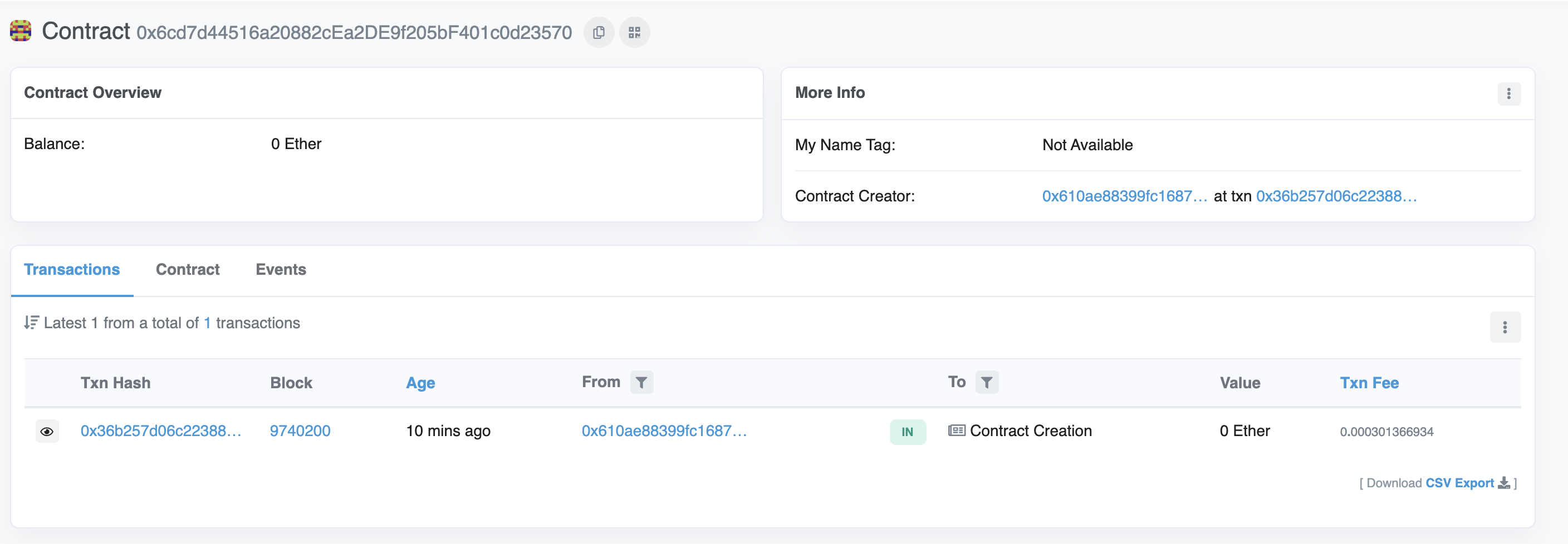 The From address should match your MetaMask account address and the To address will say “Contract Creation” but if we click into the transaction we’ll see our contract address in the To field: